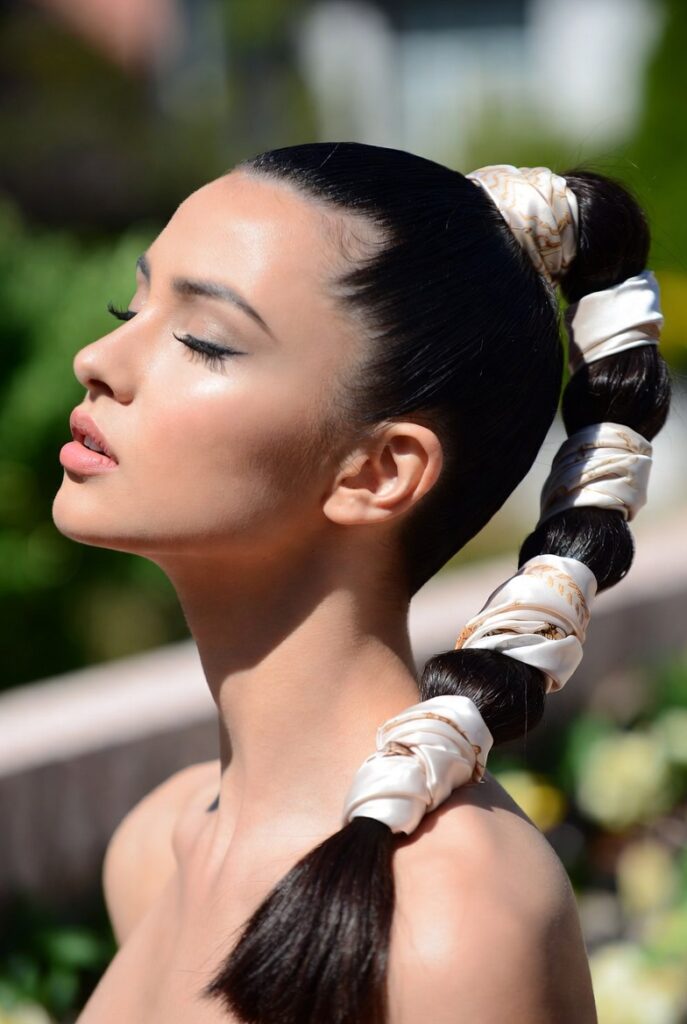 Choose a satin ribbon or a lightweight silk scarf in a color that complements your outfit. Tie it around the base of your ponytail in a neat bow, letting the ends trail down alongside your hair. For extra polish, coordinate with a matching scrunchie or hairpin. Simple, sweet, and endlessly stylish.